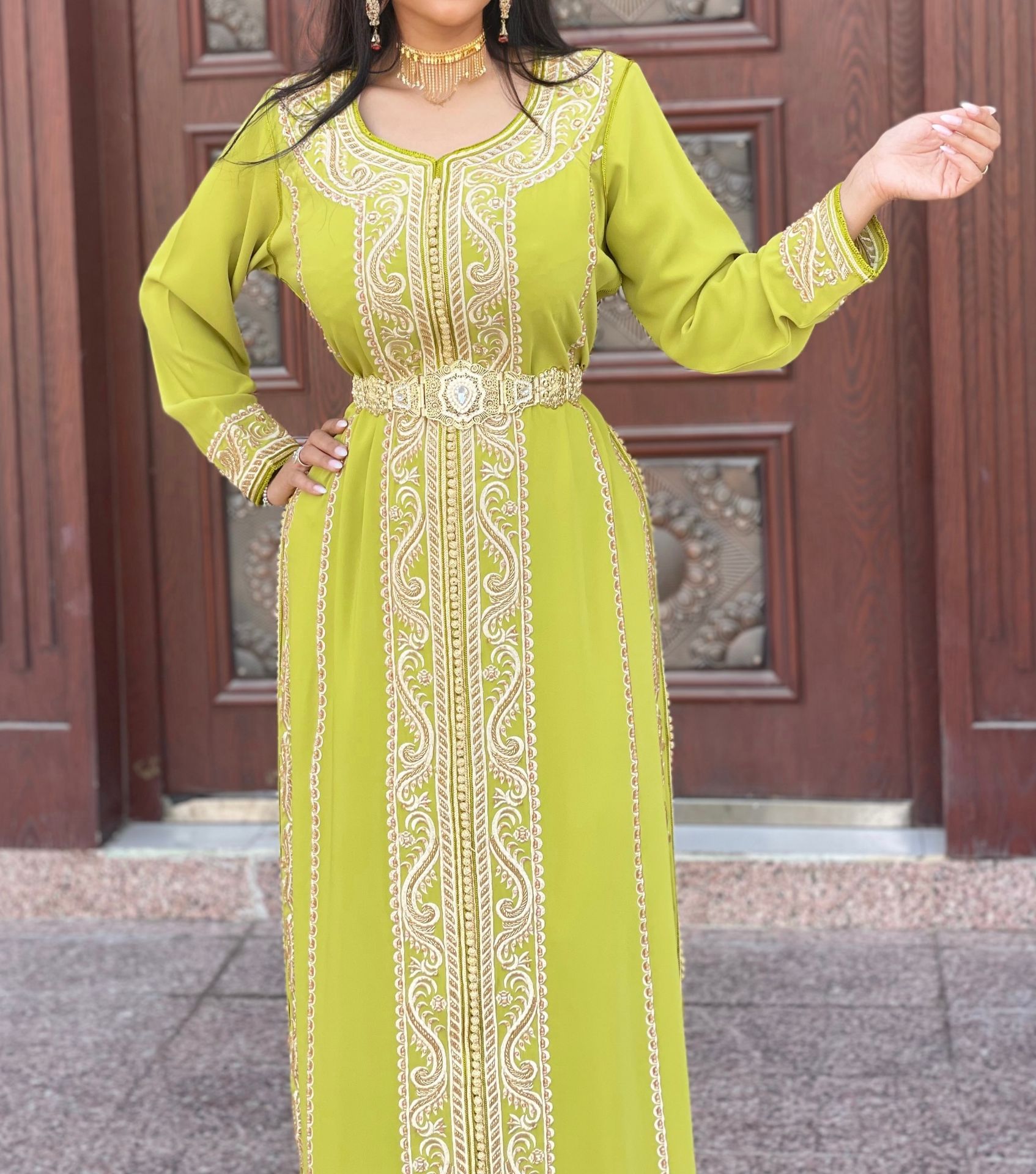 قفطان فخم باللون الاخضر الفاتح مطرز بالطرز الرباطي المغربي و بالصم المغربي الحر والسفيفة المغربية ومرصع بالاحجار الكريمة التي تمت خياطتها باتقان يدويا عن طريق شغل المعلم المغربي
